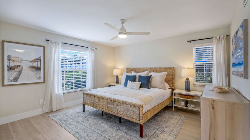 This project was a full-scale remodel of a 3 bed/2 bath vacation rental condo, where every original element was updated to create a fresh, modern, and inviting space. The renovation included new flooring, wall paint, lighting, and fixtures, along with a complete redesign of the kitchen and bathrooms. I sourced and installed all new furniture and décor, working within a client budget of $20,000 for furnishings and coming in just below that target. The final design embraces a coastal-inspired aesthetic, resulting in a bright, cohesive space that balances style and functionality while ensuring a welcoming experience for guests and strong investment value for the client.
